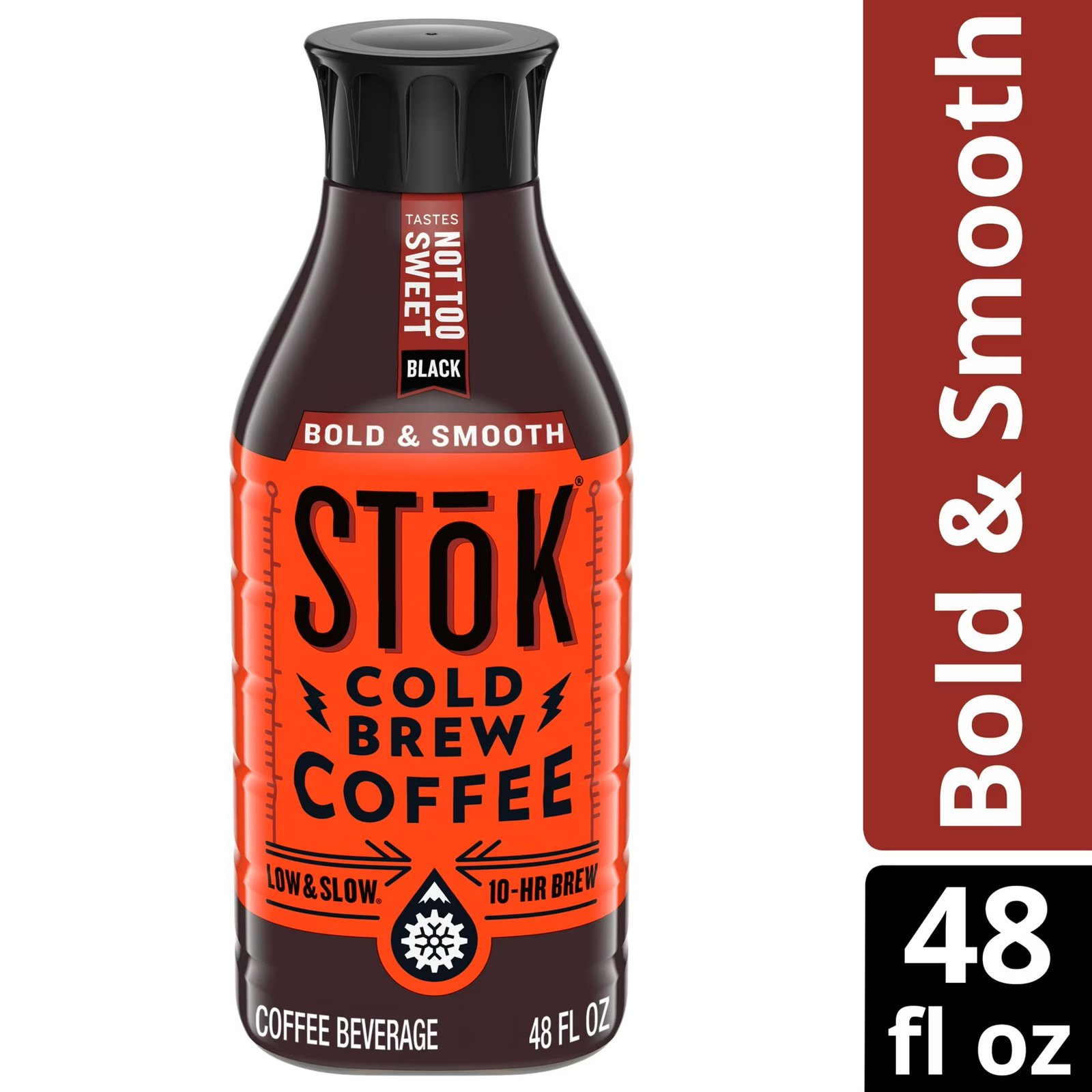 - Bold & Smooth Cold Brew: 48 fl oz bottle of black and slightly sweetened SToK Not Too Sweet Cold Brew; 130 mg of caffeine per 12 oz pour